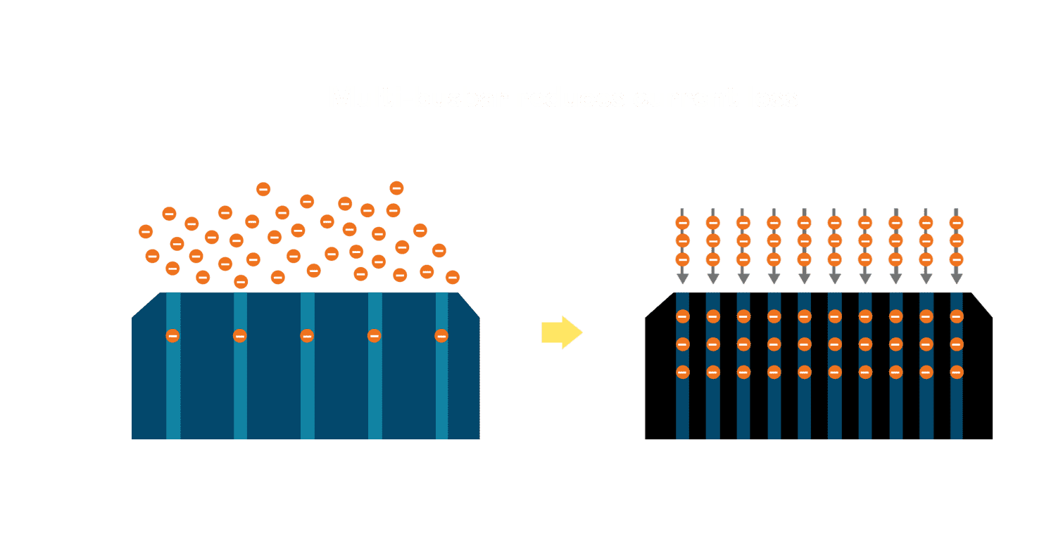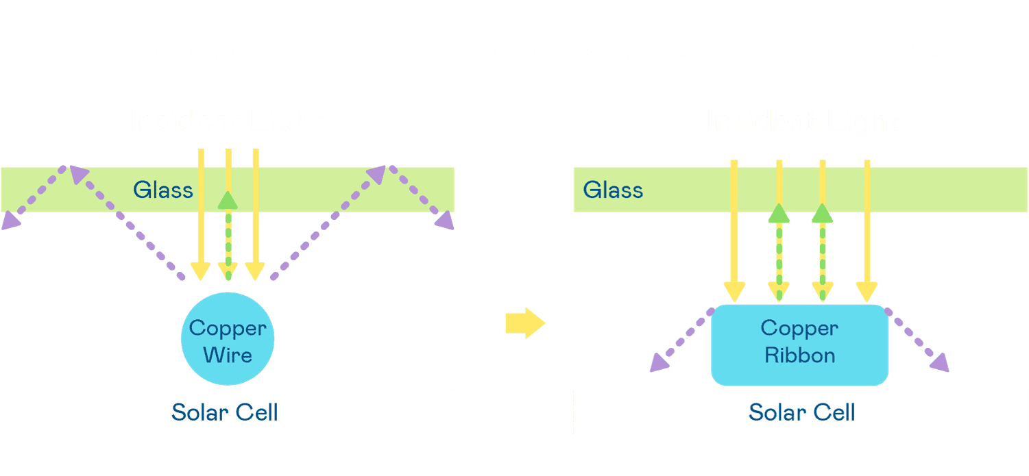 • 电池使用多条铜导线 (Copper wire) 于电池片上形成较短的电流路径,,,提高电流收集效率,,,,采用圆形设计的铜导线较传统扁平式的铜焊带 (Ribbon),,可增加入射至电池的光线量。。。。