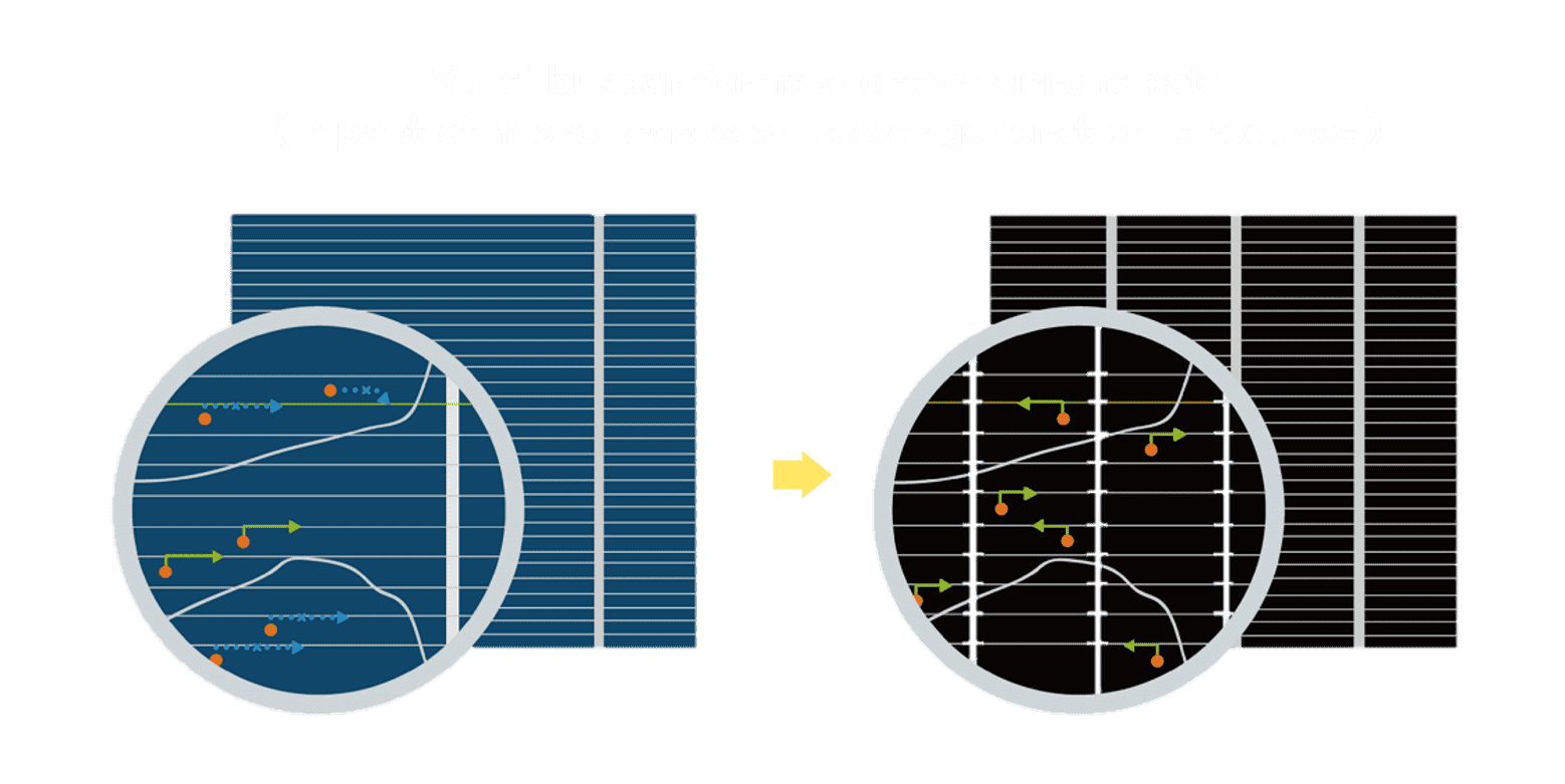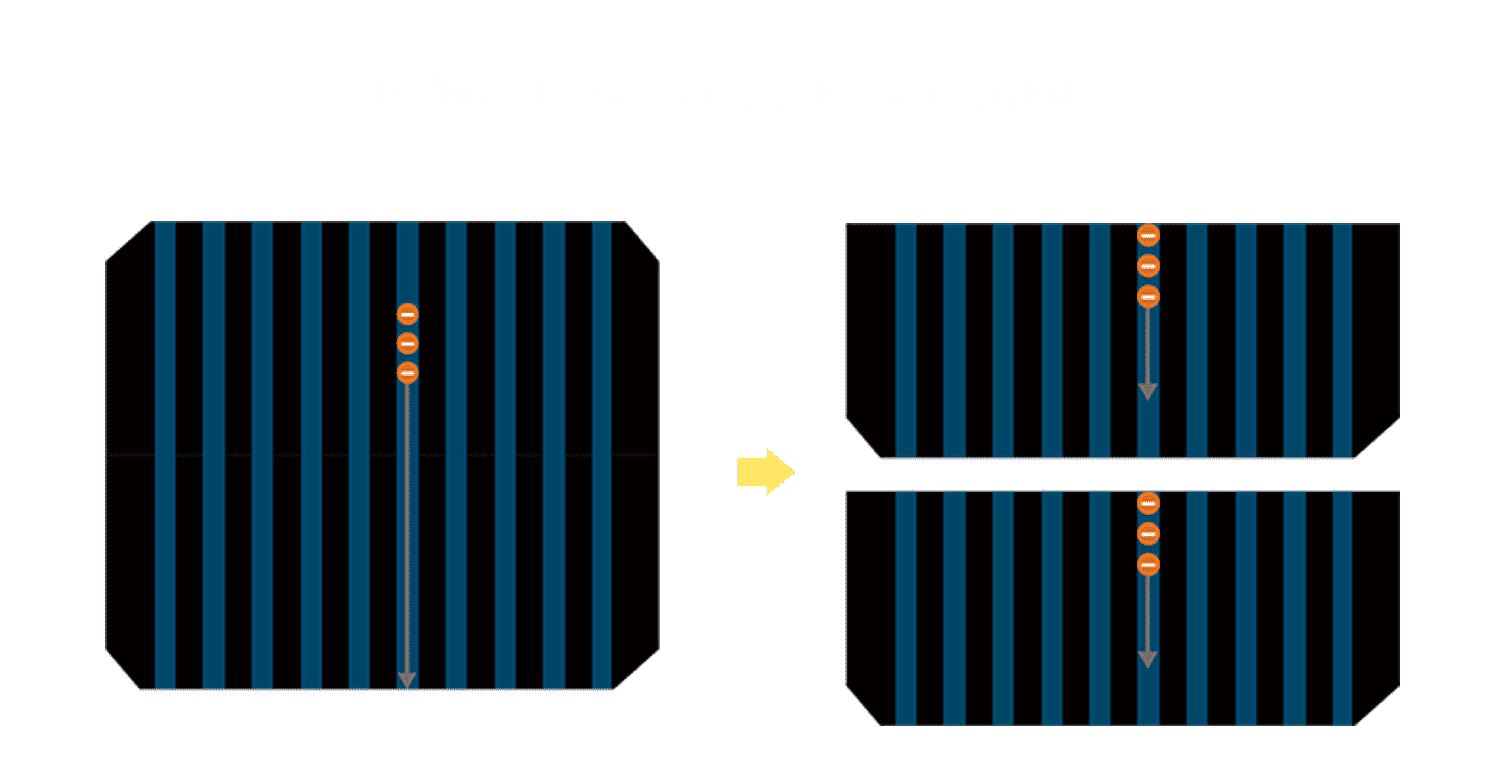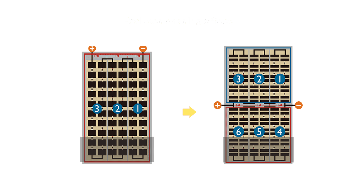 • 结合半切电池,,,降低遮阴影响、、、、提升模组抗隐裂能力、、并减少电阻损耗,,,进一步提升模组发电效能。。。
