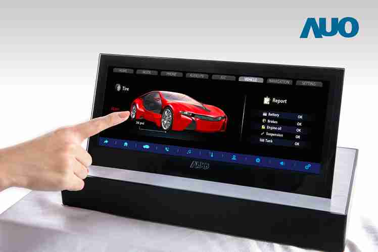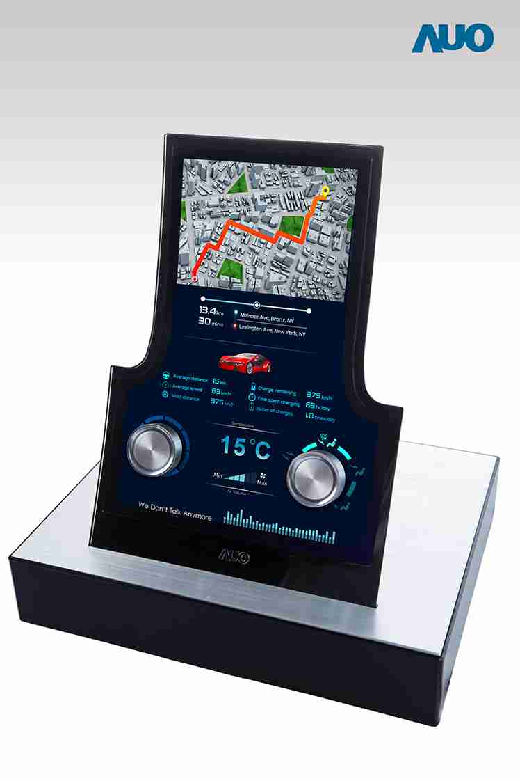 12.3 寸 Full HD LTPS 显示屏同样具备 1000 nits 高亮度,,,搭载内嵌式触控技术,,整合驱动与触控 IC 于显示屏制程,,,使显示屏厚度降低,,为中控台创造更多机构设计空间。。。。应用于抬头显示器的 3寸 LTPS 显示屏具有高穿透率、、1200:1 高对比度度,,以及 297 PPI 高画素密度。。液晶最高可耐受到 110C 的高温 (TNI) 而不液化,,,在阳光高温下维持优异稳定的显示效果。。。。